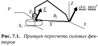 Для автоматизации указанных операций, как правило, приходится переводить силовые факторы из одной системы координат в другую. В частности, при управлении роботом такой системой координат является система XYZ, связанная со стойкой манипулятора (рис. 7.1). Подобный пересчет требует наряду с датчиком усилий также и датчик положения, определяющий координаты точки контакта P относительно системы XYZ. Следовательно, если датчик силы производит измерения в системе координат объектов O1X1Y1Z1, то для случая статического равновесия получим: