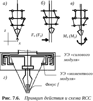 стройство, закрепленное в запястье манипулятора, состоит из двух функциональных модулей - силового, представляющего собой упругий параллелограмм и моментного в виде упругого треугольника (рис. 7.6а). Упругие элементы (УЭ), в качестве которых используются штыри на упругих шарнирах, испытывают деформации изгиба под действием четырех компонент главного вектора сил и моментов Fx, Fy, Mx и My. В ненагруженном состоянии фокус устройства (точка f), являющийся точкой приложения силовых факторов и совпадающий с точкой контакта объектов находится на оси захватного устройства. При действии компонент Fx и Fy деформируются УЭ силового модуля, смещая фокус в направлении действующей силы (рис. 7.6б). При возникновении моментов Mx и My происходит деформирование УЭ моментного модуля, и ось устройства поворачивается относительно оси симметрии на некоторый угол (рис. 7.6в). В результате действия указанных силовых факторов фокус f всякий раз перемещается в направлении действующей компоненты. (На рис. 7.6 показаны деформации устройства под действием компонент Fx и My). В настоящее время существует много модификаций схемы RCC. В большинстве из них вместо штыревых УЭ применяются эластомерные конструкции.