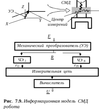 Основным элементом ССО робота является СМД, осуществляющий разложение многокомпонентного вектора F по компонентам вектора электрических сигналов U. Дальнейшее преобразование информации, в том числе и формирование управляющих воздействий в систему управления (СУ) робота реализуется либо непосредственно в датчике (концепция «интеллектуального СМД»), либо в управляющем процессоре СУ робота.