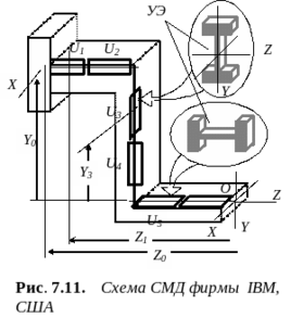 Принцип очувствления рабочей среды реализуется 4-ым вариантом ССО, включающим «очувствленный» монтажный столик, оснащенный приводами «точного» позиционирования и шестикомпонентный СМД, установленный в основании столика. Схема разработана M. Касаи в Токийском университете, Япония (рис. 7.14). Нижняя часть датчика сборочной системы, выполненная в виде плоского креста, используется для определения компонент Мх, Му, Fz, а верхняя - компонент Fx, Fy, Mz. ТР на нижней крестовине (УЭ 5, 6, 7, 8) измеряют деформации изгиба, в то время как на верхней (УЭ 1, 2, 3, 4) - сдвига. Основные соотношения для определения компонент имеют вид: