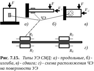 Несмотря на все многообразие конструкций СМД все они строятся на базе однотипных УЭ. Как известно, напряженное состояние, возникающее в материале УЭ, в значительной степени определяется его формой. При расчете упругих конструкций обычно выделяют четыре типа напряженных состояний: растяжение-сжатие, изгиб, сдвиг и кручение. Поэтому, и в конструктивных схемах СМД стараются использовать УЭ, деформации которых можно отнести к одному из указанных типов. В однокомпонентных датчиках так и поступают - УЭ испытывают деформацию определенного типа. В многокомпонентных СМД этого добиться труднее, в частности, в рассмотренных ранее конструкциях возникали напряженные состояния разных типов. Тем не менее, для обеспечения равной чувствительности каналов измерения стремятся уменьшить количество типов напряженных состояний в конструкции УЭ. При этом говорят, что данный датчик обладает преимущественно однотипным напряженным состоянием. Различают три типа УЭ СМД: продольные (испытывают деформацию растяжен