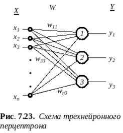 ри уменьшении сигмоид становится более пологим, и в пределе при = 0 вырождается в горизонтальную линию на уровне 0,5. При увеличении сигмоид приближается по внешнему виду к функции единичного скачка с порогом T в точке x = 0. Из выражения для сигмоида очевидно, что выходное значение нейрона лежит в диапазоне [0,1]. Простейшей нейросетью является перцептрон - сеть, нейроны которой имеют активационную функцию в виде единичного скачка. На рис. 7.23 показан однослойный трехнейронный перцептрон. На n входов поступают некие сигналы, проходящие по синапсам на 3 нейрона, образующие единственный слой этой нейросети и выдающие три выходных сигнала: