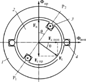 При нагрузке в роторе возникает магнитодвижущая сила, вызванная током синусной обмотки. Направление этой магнитодвижущей силы совпадает с осью синусной фазы, ее можно представить в виде суммы двух составляющих (по отношению к потоку возбуждения статора Фв): продольной и поперечной.