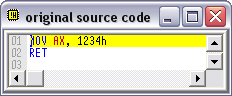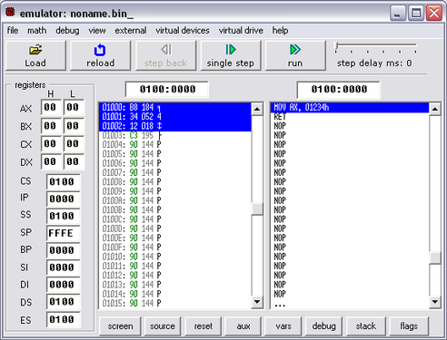 запустите программу на выполнение в пошаговом режиме и проследите за изменением значения регистров AX и IP (содержимое изменившиеся при выполнении команды регистров выделяется синим цветом), затем перезагрузите программу нажатием кнопки reload и выполните ее с помощью кнопки run