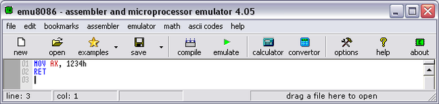 для примера напишите программу занесения числа 1234h в регистр AX: