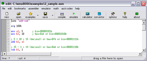 | SUB | REG, memory memory, REG REG, REG memory, immediate REG, immediate | Вычитание Алгоритм: операнд1=операнд1-операнд2 | Вычитание 2 из 5: MOV AL, 5 SUB AL, 2 ; AL = 3 RET |