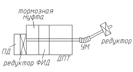 Тормозная муфта, ФИД, ДПТ находятся на валу двигателя. ПД имеет редуктор (обычный пленочный ПД), в режиме слежения привода не используется, он необходим только для режима калибровки.