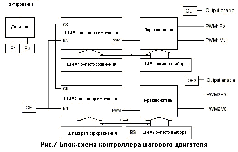 Вышеупомянутые серии МК будут использованы в качестве примера для объяснения работы встроенного контроллера ШД. Данный контроллер состоит из 4 драйверов, связанной с ними переключающей логики и двух ШИМ-генераторов. Драйвера двигателя имеют повышенный до 30мА ток нагрузки и могут быть подключены непосредственно к четырём выводам обмоток двигателя. Таким образом, маломощные ШД могут управляться напрямую, для более мощных моторов схема легко модернизируется подключением внешнего мостового драйвера.