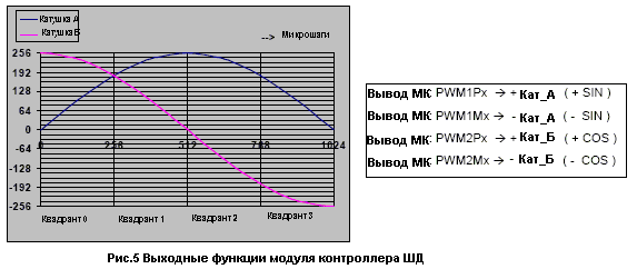 Ниже приведен пример выходной функции для модуля контроллера ШД, использующий 128 микрошагов на квадрант для каждой из таблиц синуса и косинуса, т.е. предустановленное значение для данной функции ограничено 256-ю микрошагами на квадрант. При этом мы можем легко изменять разрешение в пределах 0…7 бит на квадрант, используя только операции сдвига для приведения к требуемой разрядности и выборки из таблицы синусов/косинусов.