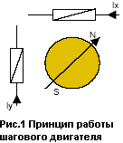 В данном описании мы применим простую эквивалентную схему замены шагового двигателя. В этой модели ротор представлен двухполюсным магнитом, а статор – двумя обмотками, расположенными перпендикулярно друг другу (Рис.1).