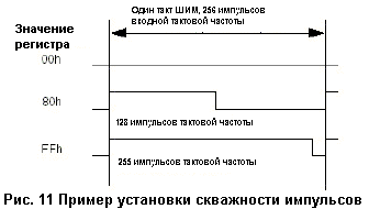Регистры сравнения ШИМ1 и ШИМ2 (PWC1n + PWC2n) определяют скважность импульсов ШИМ. Значение "00h" соответствует нулевой длительности импульса ,"FFh" соответствует коэффициенту заполнения 99.6%. Два 8-битных регистра сравнения доступны для чтения и записи в любое время, но изменённое значение вступит в силу только после завершения текущего такта ШИМ, после того, как бит BS регистра выбора PWM2 будет установлен в "1".