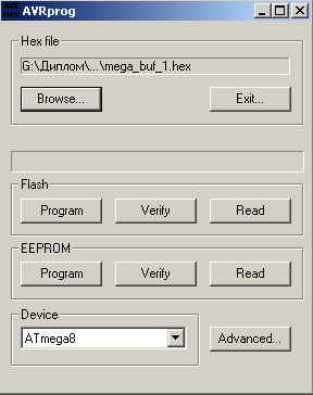 Закройте окно Advanced и в окне AVRprog в поле Flash нажмите кнопку Program. При этом начнется процесс прошивки, в результате которого выводится информация о его успешном выполнении или ошибках, в результате которых операция была прервана.