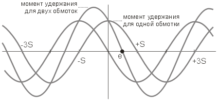 Рис. 6.1.3 Зависимость момента от угла поворота ротора для двух запитанных обмоток.