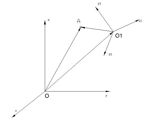 Пусть имеются две системы координат с центрами O и О1 соответственно, тогда вектор OA = OO1+O1A. Пусть координаты точки А в системе координат (О1, x1, y1, z1) известны, тогда для вычисления координат искомого вектора OA выполним следующие операции над вектором O1A: