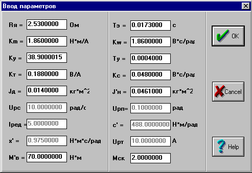 После задания конфигурации привода необходимо щелкнуть по кнопке «ОК» и перейти к заданию параметров. Для этого из меню «Ввод» необходимо выбрать команду «Ввод параметров», и на экране появится следующее диалоговое окно: