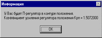Пocлe зaдaния пoльзoвaтeлeм дoбpoтнocти пpoгpaммa paccчитывaeт кoэффициeнт уcилeния П-peгулятopa пoлoжeния и cooбщaeт eгo вeличину пoльзoвaтeлю: