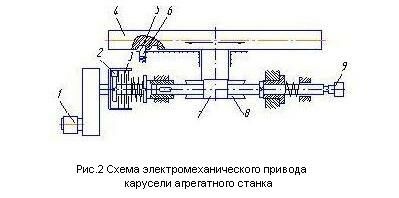 Согласно рис. 2 поворот карусели осуществляется от электродвигателя через редуктор, обгонную муфту и червячную пару. При повороте карусели вследствие скосов на фиксаторе и в гнездах карусели фиксатор утапливается, сжимая пружину. После начала поворота карусели при работающем приводе фиксатор сначала утапливается в своих направляющих, затем скользит по карусели и входит в следующее гнездо. При этом происходит реверсирование вращения электродвигателя и движение через муфту предельного момента передается на червяк.