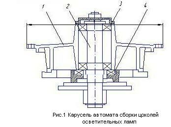 Ось 2 карусели, неподвижно закрепленная на станине автомата, поддерживает поворотную карусель 1 с помощью двух радиальных 3 и одного осевого 4 подшипников. В поворотной карусели 1 предусмотрены гнезда 5 в количестве 12 для установки обрабатываемых цоколей. Нижнее основание карусели снабжено ведомым диском 6 и элементами зацепления с поворотным механизмом.