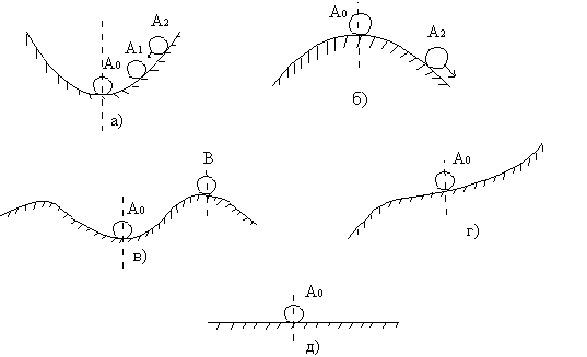 Чтобы сформулировать условия устойчивости заданного режима, введем в расмотрение понятия «невозмущенного состояния » и «возмущенного состояния ». Применительно к данному случаю ими будут соответственно являтся состояние А0 и состояние А2 (при этом внешнее возмущение, приведшее систему в это состояние, затем прекратило свое действие). Если из возмущенного состояния (т.А2) шар будет двигаться по направлению к невомущенному состоянию (т.А0), то рассматриваемое состояние равновесия (т.А0) будет устойчивым. Но поверхность, по которой движется шар, не является идеально гладкой, а потому вследствие возникающей силы трения шар, возвращаясь к состоянию равновесия, не дойдет до него и остановится в его окрестности – т.А1 на рис 3.13.а. В этом случае нет основания считать состояние равновесия, а вместе с тем и всю систему («шар – поверхность») неустойчивой, хотя шар и не вернулся в исходное состояние.