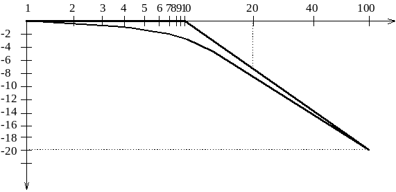 Как следует из анализа таблицы, погрешность, вносимая приближенным построением характеристики не столь значительна и достигает максимума в – 3 дб при