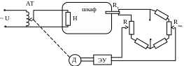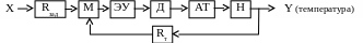 При температуре объекта, равной заданной, измерительный мост М (см. рис. 1.4) уравновешен, на вход электронного усилителя ЭУ сигнал не поступает и система находится в равновесии. При отклонении температуры изменяется сопротивление терморезистора RТ и равновесие моста нарушается. На входе ЭУ появляется напряжение, фаза которого зависит от знака отклонения температуры от заданной. Напряжение, усиленное в ЭУ, поступает на двигатель Д, который перемещает движок автотрансформатора АТ в соответствующую сторону. При достижении температуры, равной заданной, мост сбалансируется и двигатель отключится.