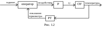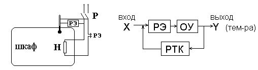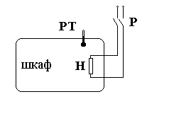 Человек-оператор в зависимости от показаний ртутного термометра РТ включает или выключает нагревательный элемент Н с помощью рубильника Р.