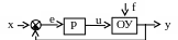 x - задающее воздействие (задание), e = х - у - ошибка регулирования, u - управляющее воздействие, f - возмущающее воздействие (возмущение).