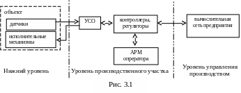 Самым нижним уровнем является уровень датчиков и исполнительных механизмов, которые устанавливаются непосредственно на технологических объектах. Их деятельность заключается в получении параметров процесса, преобразовании их в соответствующий вид для дальнейшей передачи на более высокую ступень (функции датчиков), а также в приеме управляющих сигналов и в выполнении соответствующих действий (функции исполнительных механизмов).