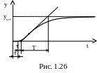 Постоянная времени Т может быть определена несколькими методами в зависимости от вида передаточной функции. Для рассматриваемой передаточной функции 1-го порядка Т определяется наиболее просто: сначала проводится касательная к точке перегиба, затем находятся точки пересечения с осью времени и асимптотой yуст; время Т определяется как интервал времени между этими точками.