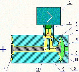 Измеряемое давление подается в камеру 7 фланца 5, который уплотнен прокладкой 8. Измеряемое давление воздействует на мембрану 6 и через жидкость воздействует на мембрану тензопреобразователя, вызывая ее прогиб и изменение сопротивления тензорезисторов. Электрический сигнал от тензопреобразователя передается из измерительного блока 1 по проводам через гермовывод 2.