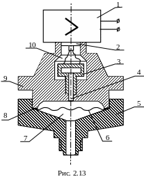 Мембранный тензопреобразователь 3 размещен внутри основания 9 (см. рис. 2.13). Внутренняя полость 4 тензопреобразователя заполнена кремнийорганической жидкостью и отделена от измеряемой среды металлической гофрированной мембраной 6, приваренной по наружному контуру к основанию 9. Полость 10 сообщена с окружающей атмосферой.