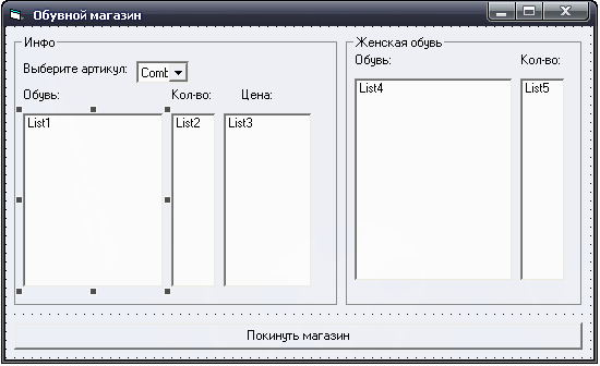 Используя ComboBox, мы выбираем нужный нам артикль. В List1, List2, List3 выводится информация по выбранному артиклю. В поля List4, List5 выводится информация о женской обуви. По нажатию на кнопку «Выход» программа завершает свою работу.