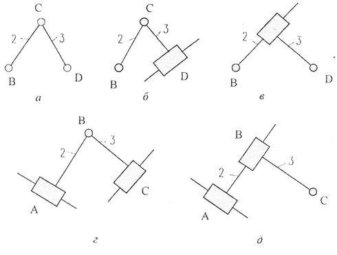 а – диада 1 вида; б – диада 2 вида; в – диада 3 вида; г – диада 4 вида; д – диада 5 вида