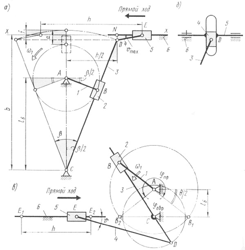 Прямой ход ползуна 5 совершает при повороте кривошипа 1 на угол