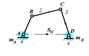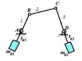 Разместим на звеньях 1 и 3 противовесы (корректирующие массы) mК1, mК2 с таким расчетом, чтобы центры масс систем (mВ, mК1) и (mС, mК3) оказались бы в точках A и D. Для этого должны быть выполнены соотношения: