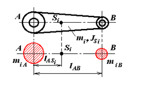 При использовании метода замещающих масс, звено механизма с распределенной массой заменяется расчетной моделью, которая состоит из точечных масс. Точки приведения масс можно выбирать произвольно, но обычно замещающие массы располагают в шарнирах.