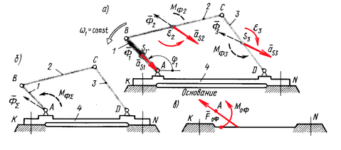 Рассмотрим плоский механизм (рис. 10.1), начальное звено 1 которого вращается с постоянной угловой скоростью. При этом все остальные звенья будут двигаться с угловыми ускорениями, а центры масс S1, S2, S3 будут иметь линейные ускорения.