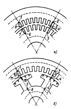 делении электрической машины: а — с распределенной обмоткой;