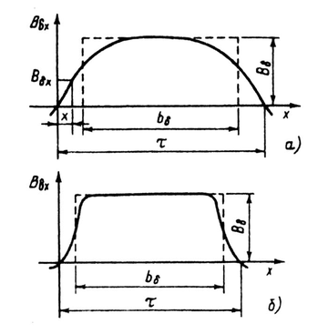 В воздушном зазоре электрической машины индукция непостоянна. При распределенной обмотке она изменяется по кривой, близкой к синусоиде (рис. 4.2, а), а при сосредоточенных обмотках имеет форму, приближающуюся к прямоугольнику (рис. 4.2, 6). Значение потока на полюсном делении