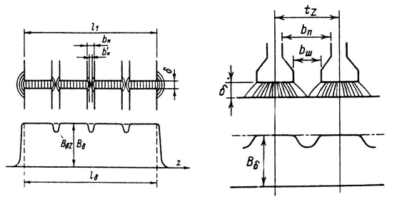 В большинстве машин поверхности статора и ротора, ограничивающие воздушный зазор, не гладкие, а имеют различные неровности: пазы, углубления для размещения бандажей и др. Магнитное сопротивление участков такого зазора в поперечном сечении машины различно, поэтому распределение индукции по площади воздушного зазора неравномерно. Наибольшая неравномерность возникает из-за наличия зубцов на статоре и роторе. Над коронками зубцов магнитные линии сгущаются, а над прорезями пазов плотность линии уменьшается (рис. 4.4). В кривой индукции в воздушном зазоре появляются провалы. Магнитное сопротивление и магнитное напряжение воздушного зазора при неравномерной индукции возрастают.