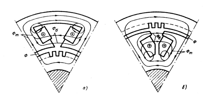 Магнитные силовые линии потока в явно выраженных полюсах показаны на рис. 4.8. Как видно, независимо от того, расположены полюса на статоре (на станине в машинах постоянного тока) или на роторе (в синхронных машинах), поток в полюсе состоит из двух