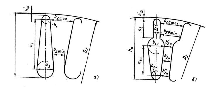 а — с трапецеидальными пазами; б — с лопаточными пазами