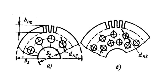 Аксиальные каналы (рис. 9.43) могут быть расположены в одном ряду (mк2 = 1) или при больших диаметрах ротора в двух рядах (mк2 = 2). Число аксиальных каналов в сердечнике ротора обычно колеблется от 9 до 12, а их диаметр (dк2) — в пределах от 15 до 30 мм. Большие диаметры выполняют в роторах двигателей с большим числом полюсов. При расположении каналов в два ряда их диаметры уменьшают.