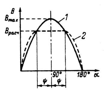 определить Нрасч по основной кривой намагничивания и увеличить затем результат в k = 1/ 0,82 раз, приведя напряженность к амплитудному значению индукции. Для воздушного зазора, имеющего линейную зависимость Н = f (B), эта операция равносильна непосредственному определению магнитного напряжения зазора по Вδ. При определении магнитных напряжений участков магнитной цепи с нелинейными магнитными характеристиками влияние уплощения учитывается специальными кривыми намагничивания для зубцов и ярм асинхронных двигателей, построенными по основной кривой намагничивания с учетом указанных зависимостей. При этом принимают