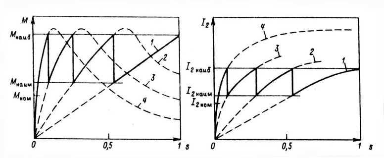 1—3 — характеристики при различных ступенях пускового реостата с последовательно убывающими значениями сопротивлений; 4 — естественные характеристики; Мнаиб, Мнаим — наибольший и наименьший моменты, развиваемые двигателем в процессе реостатного пуска; I2наиб, I2нанм — наибольший и наименьший токи ротора во время разгона двигателя
