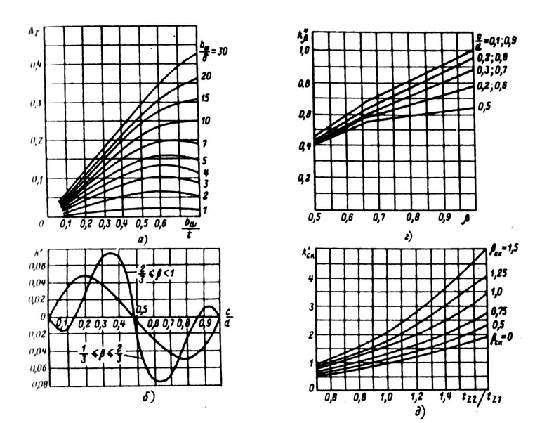 В этих формулах коэффициенты Δz, k', k" и k"β определяют по кривым, приведенным на рис. 9.51. Для определения k"β и k' необходимо найти дробную часть числа q, равную c/d (дробное число q = b + c/d, где b — целое число, c/d < 1 — дробная часть числа q), коэффициент k'β — по (9.156) или (9.157).