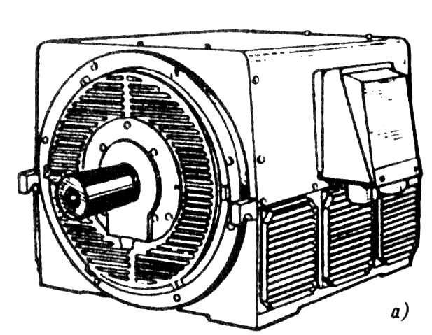 корпусом образуются каналы для прохода охлаждающего воздуха. Охлаждение двигателей — радиальное двустороннее. Охлаждающий воздух проходит внутрь корпуса через жалюзи в подшипниковых щитах и направляется диффузорами на вентиляционные лопатки, отлитые вместе с обмоткой и замыкающими кольцами статора. Вентиляционные лопатки отбрасывают воздух на лобовые части обмотки статора. Далее воздух омывает наружную поверхность сердечника статора и выбрасывается через жалюзи, расположенные по бокам в нижней части корпуса.