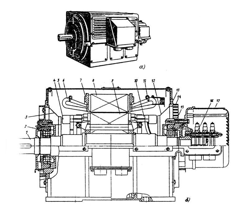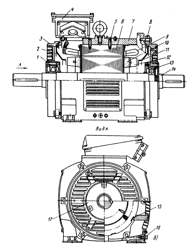 а — общий вид; б — продольный и поперечный разрезы; 1, 13 — подшипники; 2, 11 — диффузоры; 3. 8 — подшипниковые щиты; 4 — коробка выводов; 5 — стопорный винт; 6 — сердечник статора; 7 — корпус; 9 — лобовые части обмотки статора; 10 — короткозамыкающее кольцо обмотки ротора; 12 — вентиляционные лопатки; 14 — вал; 15 — скобы крепления сердечника статора; 16 — болт заземления; 17 — подшипниковая крышка