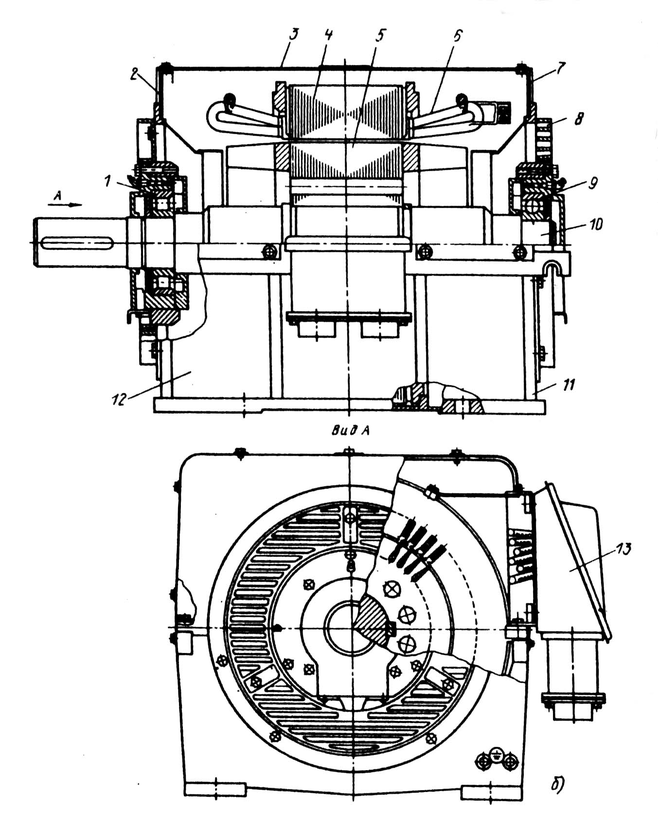 11 — бандажное кольцо обмотки статора; 13 — подшипниковый щит;