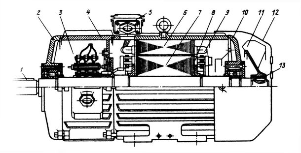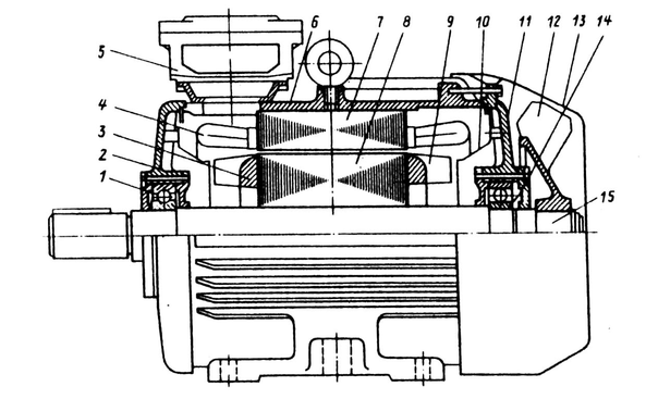 1 — вал; 2,9 — подшипниковые щиты; 3 — коробка выводов; 4 — сердечник статора;